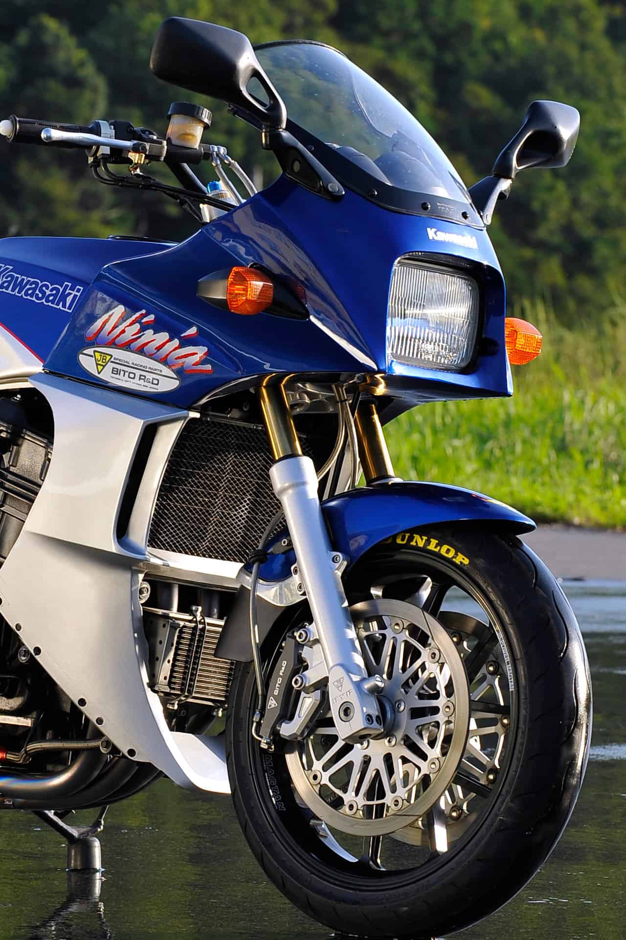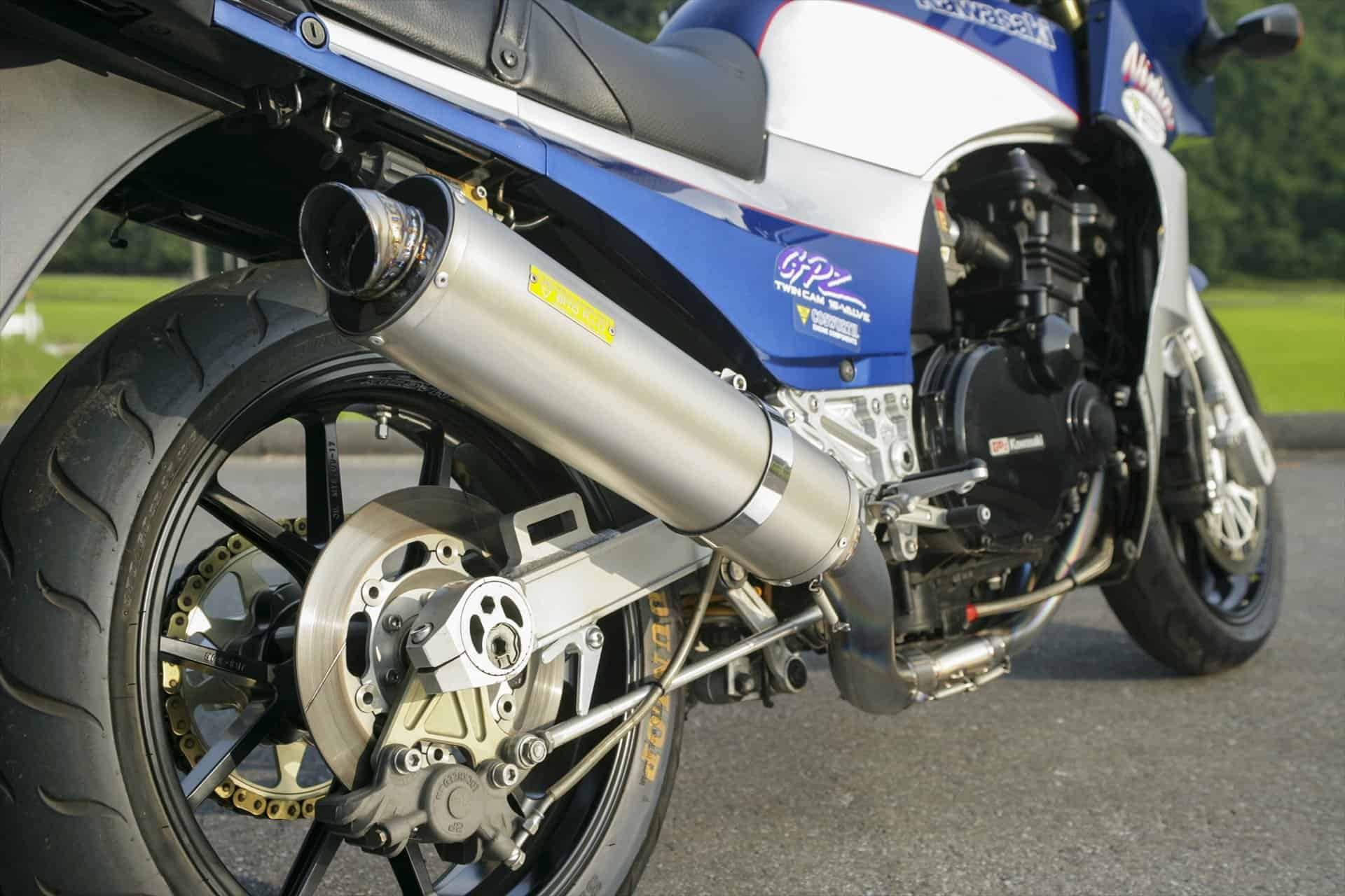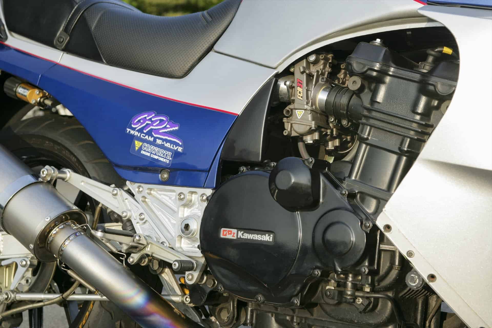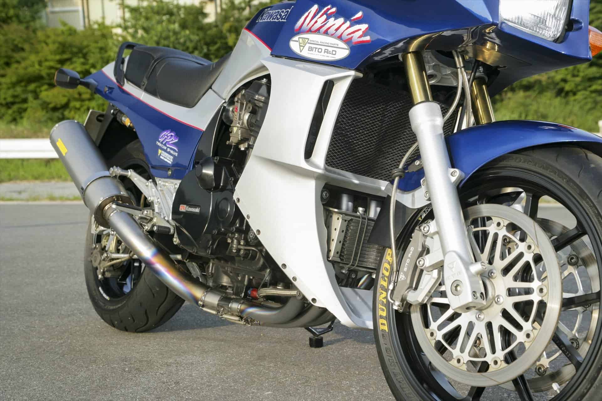 The GPZ900R NINJA was released in 1984 aiming for the pinnacle of the super-sports class, carrying on the Kawasaki proud heritage as “The Next Z”. Equipped with Kawasaki’s outstanding, first-generation liquid-cooled, side-cam chain four-cylinder engine, the machine has left a technological footprint that continues till the present. The GPZ900R’s continued admiration by many fans and appearances in Hollywood movies made it famous all over the world – A motorcycle that truly changed the course of Kawasaki’s history. The avant-garde combination of 16-inch front and 18-inch rear wheels is said to give the NINJA its special character. However, in changing to 18-inch forged magnesium wheels, BITO R&D managed to achieve a neutral, easy to control handling. A bore-up piston kit and special porting gave a significant boost to the already impressive engine performance and retiring the separate handle in favor of a handlebar, a new rear set as well as a revised seat shape, all of which create an optimized riding position. The engine revs obediently to the rider’s command and the acceleration potential seems to be limitless. However, the neutral handling created by 18-inch wheels, and the relaxed riding position provide not only the joy of cornering but also comfort on extended trips and the exquisite pleasure of riding in a leisurely dialog with your bike. With the JB-POWER NINJA, a motorcycle that teaches the true pleasure of riding was born!